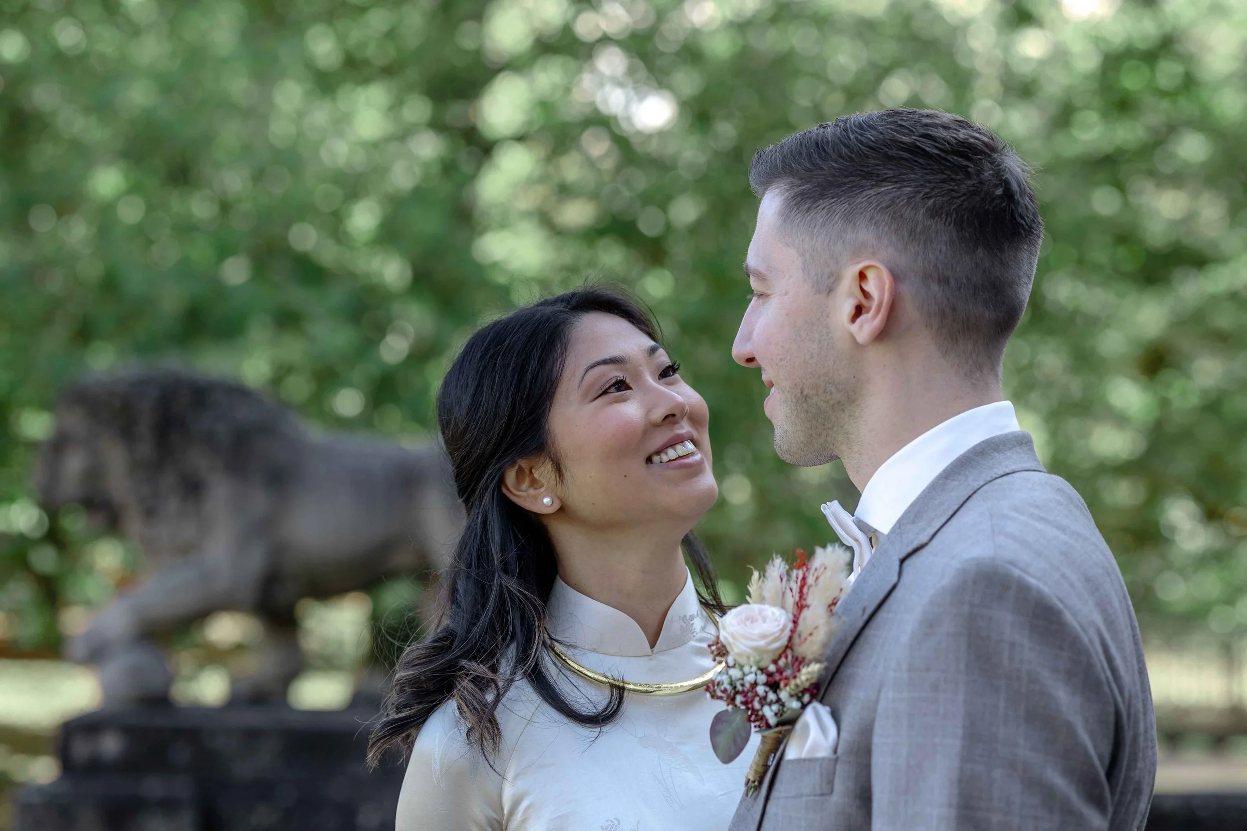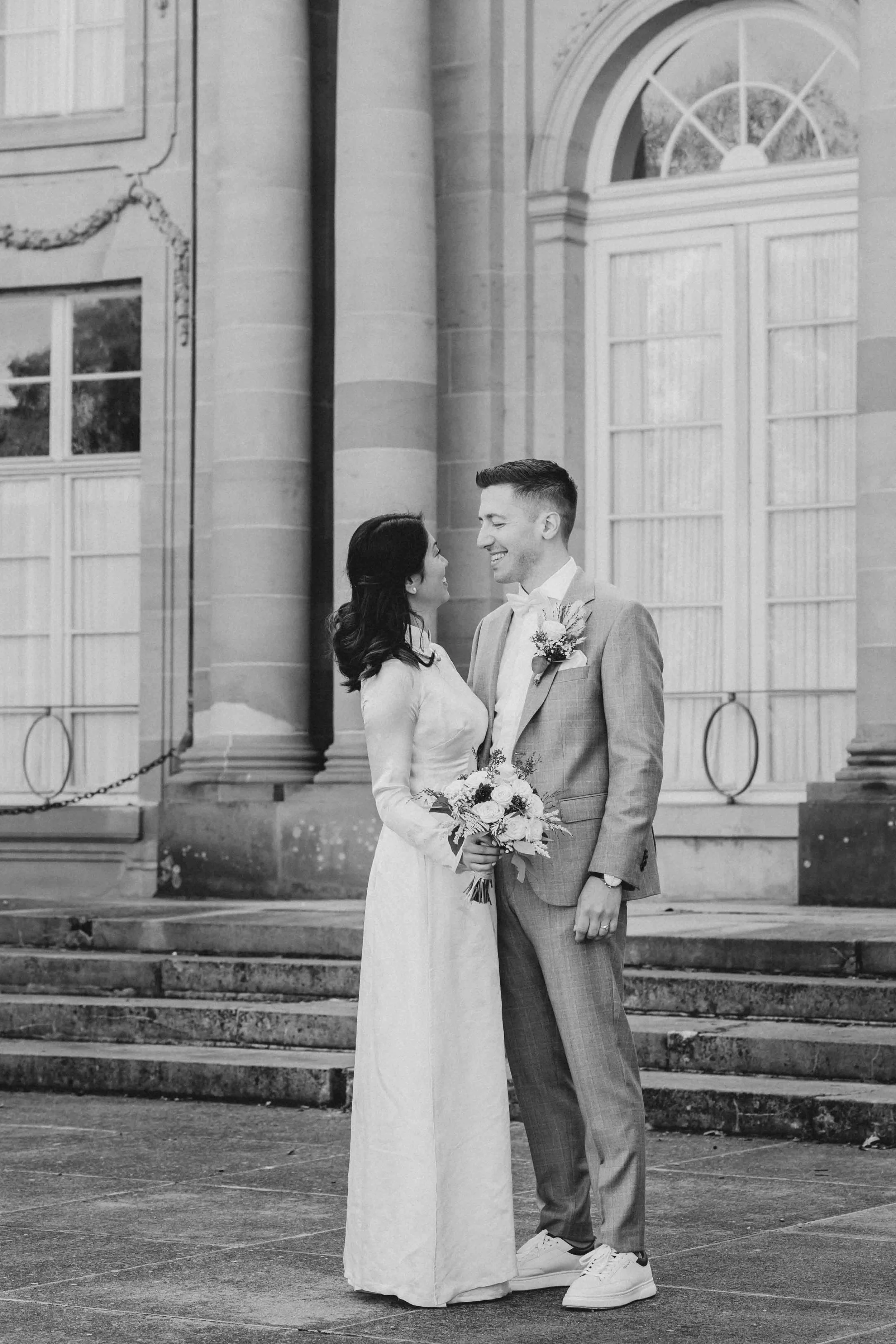 Eine meiner liebsten Aufnahmen des Tages entstand vor der historischen Kulisse des Monrepos, wo Huyen und Benny in ihrem strahlenden Glück regelrecht mit der Umgebung verschmolzen. Der Kontrast zwischen dem modernen Look Bennys und dem traditionellen Kleid von Huyen machte die Bilder zu etwas Einzigartigem.
